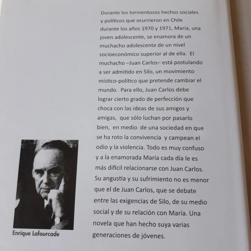 PALOMITA BLANCA / ENRIQUE LAFOURCADE Durante los tormentosos hechos sociales y políticos que ocurrieron en Chile durante los años 1970 y 1971, María, una joven adolescente, se enamora de un muchacho adolescente de un nivel socioeconómico superior al de ella. El muchacho -Juan Carlos- está postulando a ser admitido en Silo, un movimiento místico-político que pretende cambiar el mundo. Para ello, Juan Carlos debe lograr cierto grado de perfección que choca con las ideas de sus amigos y amigas, que sólo luchan por pasarlo bien.