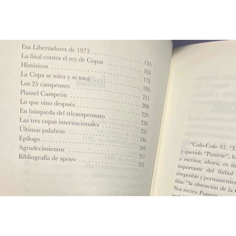 Colo Colo 91 La Copa Se Mira Y Se Toca / Puntete Reseña: Escribir de la Copa Libertadores de Colo-Colo es un deleite para el paladar literario, porque no existe otra campaña más llena de historias, anécdotas, recuerdos y sabores que esa, y porque sigue alzándose como el punto más alto de la historia de Chile a nivel de clubes. Por eso no es raro que sea Colo-Colo quien la exponga galantemente en sus vitrinas, porque además de ser el equipo más grande de Chile, el más ganador de Chile y el que más hinchas tiene en Chile, es el equipo que ha sabido ser campeón. Campeón de Chile y, más importante aún, campeón de la Copa Libertadores de América. Eso es escribir un legado; eso es escribir de Colo-Colo.