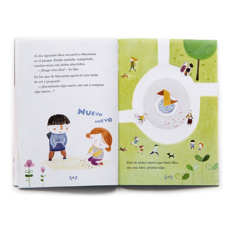 ¡quiero Algo Nuevo! / Gabriela Keselman ¿Quién no deseó despertarse y descubrir, de pronto, algo nuevo y divertido a su alrededor? Maca, todos los días se despierta con muchas ganas de tener algo nuevo y lo grita al barrio entero. Su vecino decide proponerle infinitos juegos novedosos hasta que... se le acaban las ideas. Mientras Blas sigue pensando, la niña descubrirá qué es lo que realmente desea...