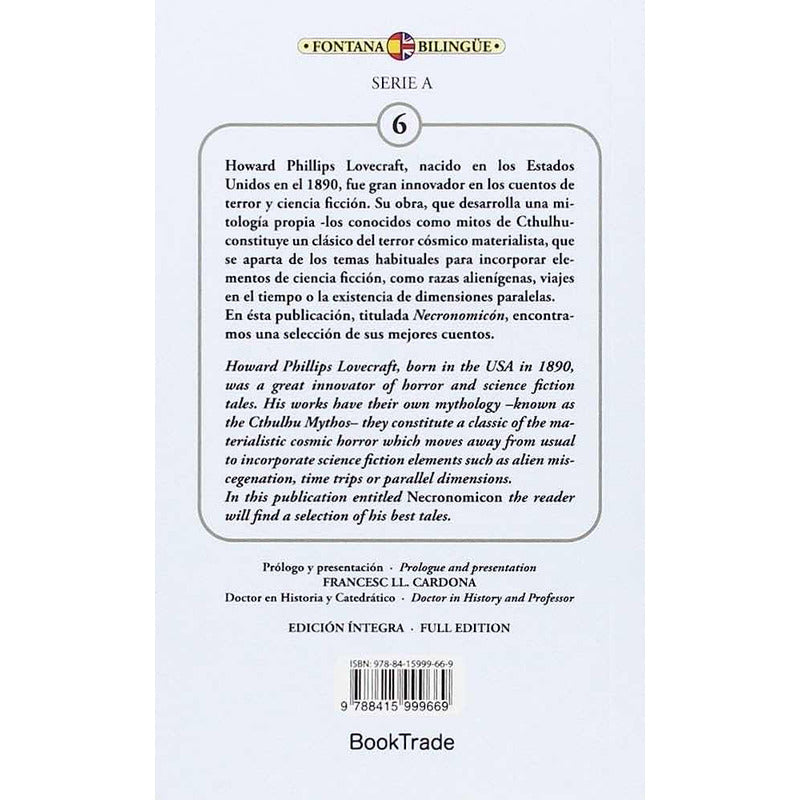 Howard Phillips Lovecraft, nacido en los Estados Unidos en el 1890, fue gran innovador en los cuentos de terror y ciencia ficción. Su obra, que desarrolla una mitología propia -los conocidos como mitos de Cthulhu- constituye un clásico del terror cósmico materialista, que se aparta de los temas habituales para incorporar elementos de ciencia ficción, como razas alienígenas, viajes en el tiempo o la existencia de dimensiones paralelas. En ésta publicación, titulada Necronomicón, encontramos una selección de sus mejores cuentos. Howard Phillips Lovecraft, born in the USA in 1890, was a great innovator of horror and science fiction tales. His works have their own mythology –known as the Cthulhu Mythos– they constitute a classic of the materialistic cosmic horror which moves away from usual to incorporate science fiction elements such as alien miscegenation, time trips or parallel dimensions. In this publication entitledNecronomicon the reader will find a selection of his best tales.