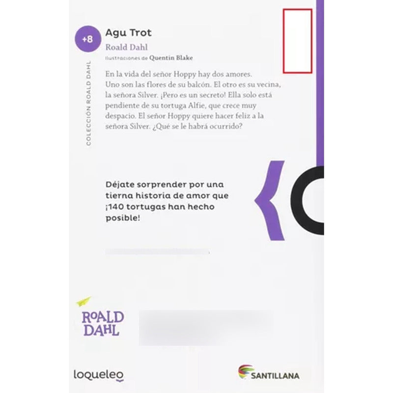 AGU TROT / ROALD DAHL Reseña: En la vida del señor Hoppy hay dos amores. Uno son las flores de su balcón. El otro es su vecina, la señora Silver. ¡Pero es un secreto! Ella solo está pendiente de su tortuga Alfie, que crece muy despacio. El señor Hoppy quiere hacer feliz a la señora Silver. ¿Qué se le habrá ocurrido?
