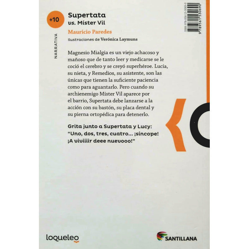 SUPER TATA VS MR VIL / MAURICIO PAREDES Reseña: Magnesio Mialgia es un viejo achacoso y mañoso que de tanto leer y medicarse se le coció el cerebro y se creyó superhéroe. Lucía, su nieta, y Remedios, su asistente, son las únicas que tienen la suficiente paciencia como para aguantarlo. Pero cuando su archienemigo Míster Vil aparece por el barrio, Supertata debe lanzarse a la acción con su bastón, su placa dental y su pierna ortopédica para detenerlo.