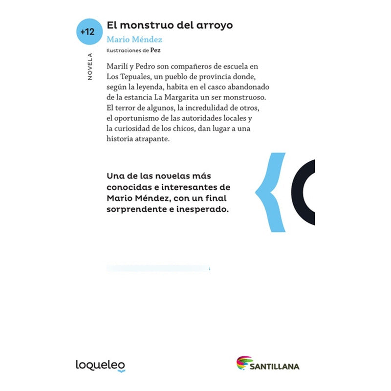 EL MONSTRUO DEL ARROYO / MARIO MENDEZ Reseña: Marilí y Pedro son compañeros de escuela en Los Tepuales, un pueblo de provincia donde, según la leyenda, habita en el casco abandonado de la estancia La Margarita un ser monstruoso. El terror de algunos, la incredulidad de otros, el oportunismo de las autoridades locales y la curiosidad de los niños dan lugar a una historia atrapante. Una de las novelas más conocidas e interesantes de Mario Méndez con un final que te sorprenderá.