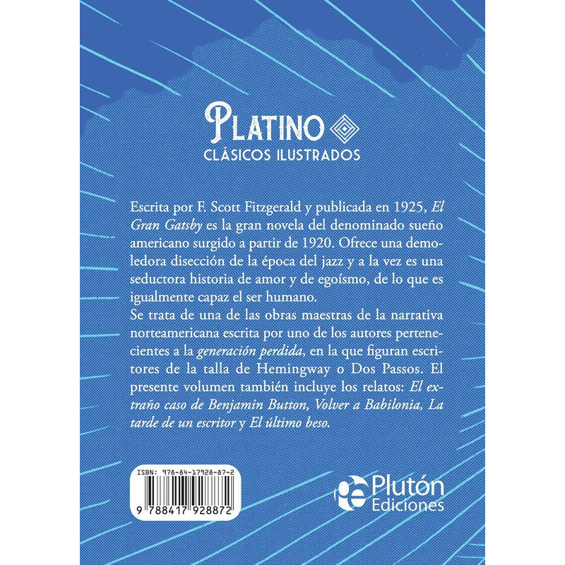 EL GRAN GATSBY Y OTROS RELATOS / F.S. FITZGERALD Escrita por F. Scott Fitzgerald y publicada en 1925, “el gran Gatsby” es la gran novela del denominado sueño americano surgido a partir de 1920. Ofrece una demoledora disección de la época del jazz y a la vez es una seductora historia de amor y de egoísmo, de lo que es igualmente capaz el ser humano. Se trata de una de las obras maestras de la narrativa norteamericana escrita por uno de los autores pertenecientes a la generación perdido, en la que figuran escritores de la talla de Hemingway o dos passos. El volumen incluye los relatos: “el extraño caso de Benjamin button”, “volver a Babilonia”, “la tarde de un escritor” y “el último beso”. la presente edición contiene ilustraciones de Katherine Silva y está presentada en formato de 13, 5 x 19 cms, con encuadernación tapa dura y marca páginas de hilo.