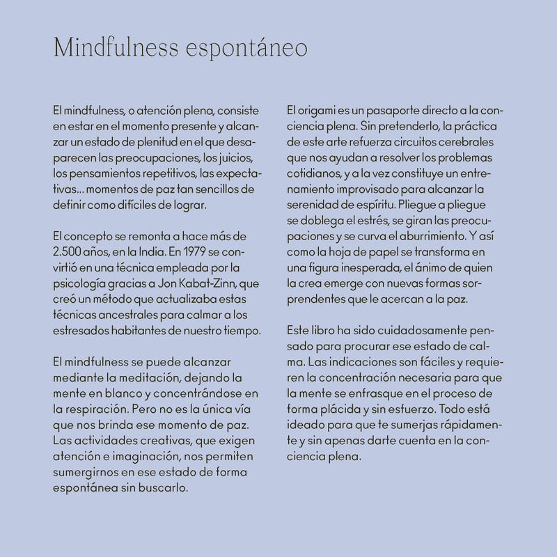 ORIGAMI / VARIOS AUTORES Reseña: 144 Páginas. Practicar origami es acercarse al arte para alejarse del estrés. El proceso de convertir una hoja de papel en una pequeña escultura serena la mente y ayuda a practicar el mindfulness. En este libro encontrarás 15 diseños sorprendentes, al alcance de todo el mundo, que se pueden realizar fácilmente. Los beneficios tanto para adultos como para niños son numerosos. ¡No esperes más para convertirte en un origamista!