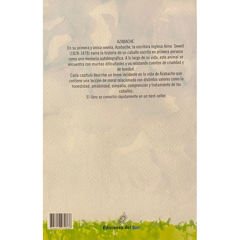 Azabache / Anna Sewell Reseña: Es posible que muchos lectores no hayan oído hablar de Anna Sewell, pero no por ello deja de ser una de las grandes escritoras que ha dejado la literatura.Su obra cumbre, Black Beauty (en español traducida como Azabache) tiene el honor de ser una de las diez novelas infantiles más vendidas en todos los idiomas.Anna Sewell fue una novelista británica que nació en Great Yarmouth, en Norfolk, un 30 de marzo de 1820, dentro del seno de una familia de cuáqueros muy devota.Cuando era una adolescente un trágico accidente le lastimó seriamente los tobillos, hecho que la obligaría a usar de por vida una muleta o acompañante. Unos años después comenzaría a tener también problemas hepáticos.Su obra cumbre, Azabache, la publicó en 1877, un año antes de morir a causa de su enfermedad. La obra la vendió a una gran editorial, pero desgraciadamente apenas pudo disfrutar del éxito que comenzó a tener entre los lectores.Curiosamente, la autora no escribió este libro pensando en el público infantil, sino más bien en las personas que trabajaban con caballos. Su amor por los caballos transmitió a esta historia una personalidad única.La historia es narrada por Azabache, el caballo protagonista. Junto a él viajamos por toda su vida desde que era un potrillo hasta que alcanzó la vejez. Cada capítulo lo enfrenta a un problema y deja una moraleja para el lector.Así que, lector, disfruta de la obra de Anna Sewell. Vive la vida de Azabache…