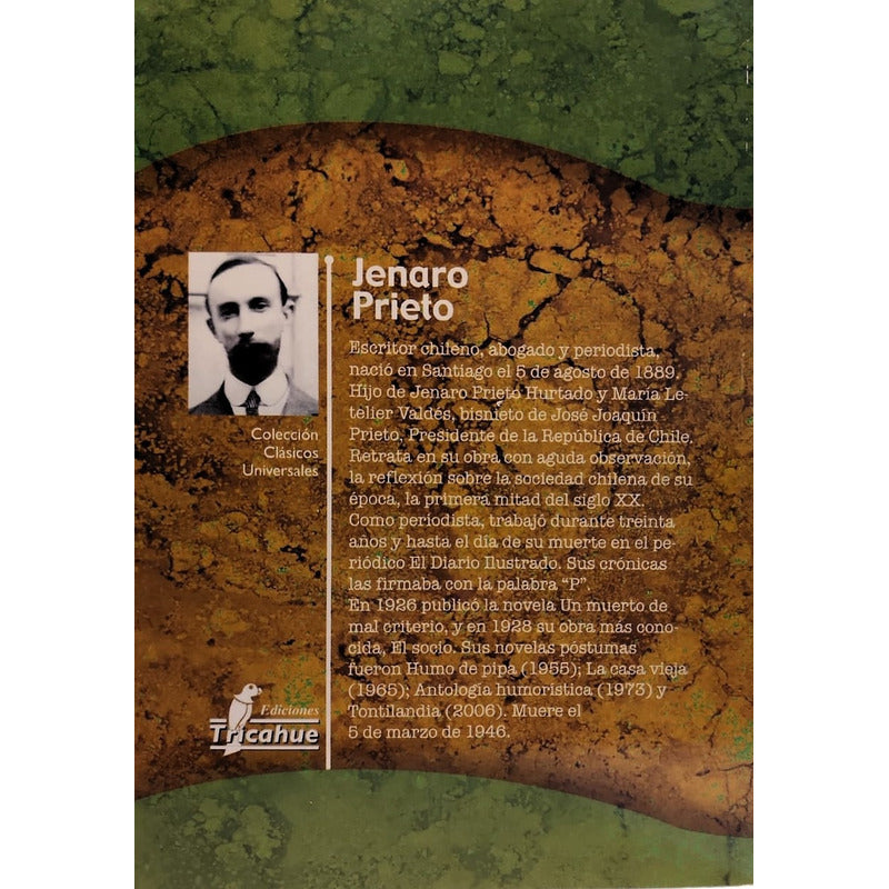 El socio / Jenaro Prieto Reseña: El Socio es, sin duda, uno de los textos más valiosos que desde la narrativa nacional han salido al mundo, puesto que su fama ha traspasado las fronteras siendo traducida a varias lenguas y llegando incluso al cine. Y es que si bien Prieto sitúa la historia en un contexto reconocible, éste no la limita; el autor construye una historia ágil, que atrapa desde el primer momento y en la que podemos reconocer y reconocernos. Tal vez esa sea uno de los factores decisivos del éxito que esta obra tiene aún hoy, a más de 70 años de su publicación: Por medio de la historia de Pardo, lo que el autor nos muestra es la serie de conflictos que surgen de la vulnerabilidad y permebealidad del hombre y ésta obra puede ser, desde esta perspectiva, vista tanto como un monumento literario, como un documento humano.
