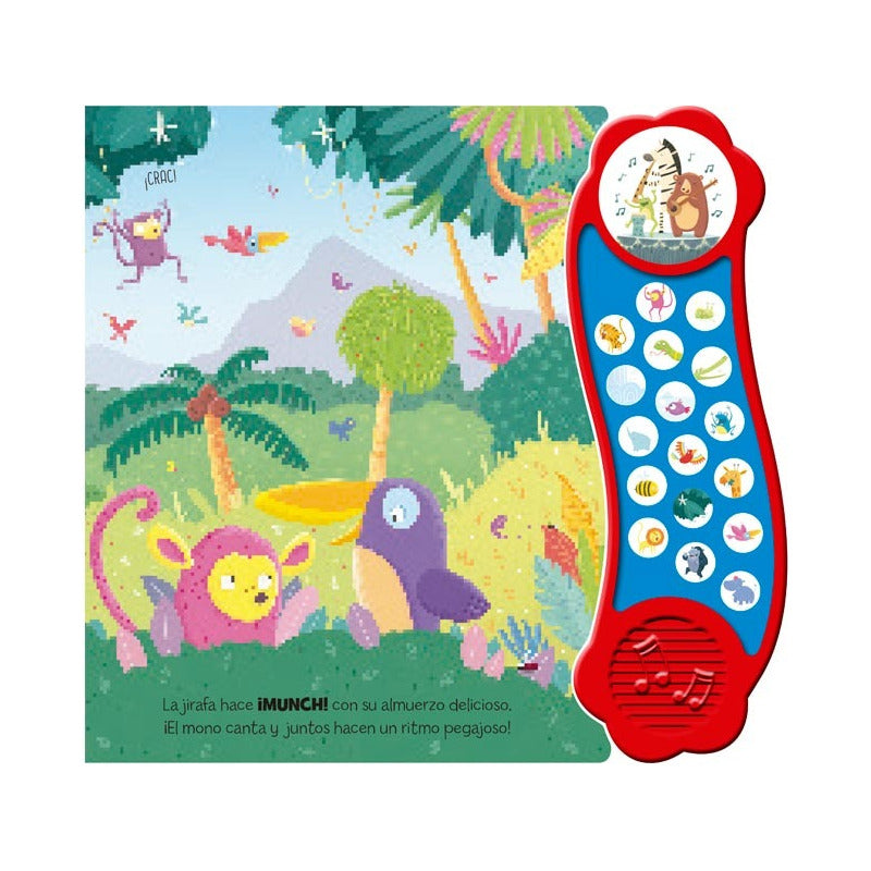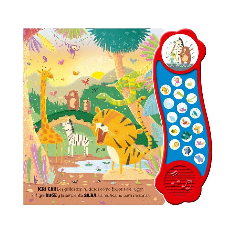 Selva Ruidosa – Con 18 fantásticos Sonidos / Lexus La selva vibrante retumba con todo tipo de sonidos. Acompaña al mono en su misión musical para hacer que la selva y sus amigos hagan el mayor ruido posible. 18 botones de sonido, incluyendo una alegre canción y una divertida historia con rimas, ¡los pequeños lectores disfrutarán de esta aventura en la selva! Volumen en tapa dura. Interiores en cartón plastificado brillante Tamaño 28.2 x 27.5 cm. 8 páginas con bellas ilustraciones 18 sonidos