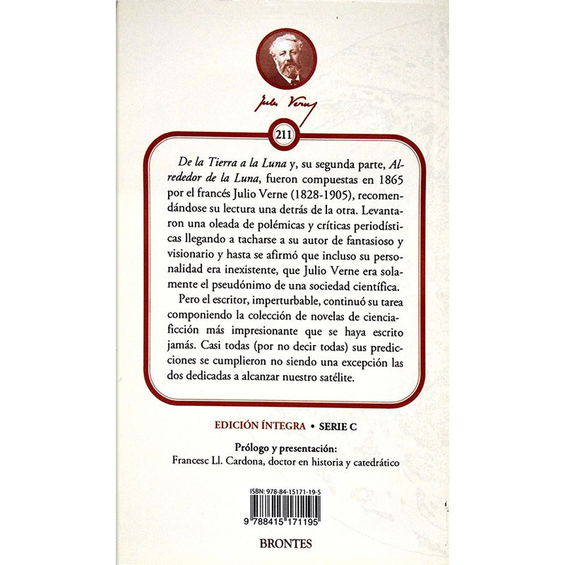 De la Tierra a la Luna Julio Verne 12 x 18 cm / 256 páginas / ISBN: 978-84-10109-17-9 De la Tierra a la Luna y, su segunda parte, Alrededor de la Luna, fueron compuestas en 1865 por el francés Julio Verne (1828-1905), recomendándose su lectura una detrás de la otra. Levantaron una oleada de polémicas y críticas periodísticas llegando a tacharse a su autor de fantasioso y visionario y hasta se afirmó que incluso su personalidad era inexistente, que Julio Verne era solamente el pseudónimo de una sociedad científica. Pero el escritor, imperturbable, continuó su tarea componiendo la colección de novelas de ciencia-ficción más impresionante que se haya escrito jamás. Casi todas (por no decir todas) sus predicciones se cumplieron no siendo una excepción las dos dedicadas a alcanzar nuestro satélite.