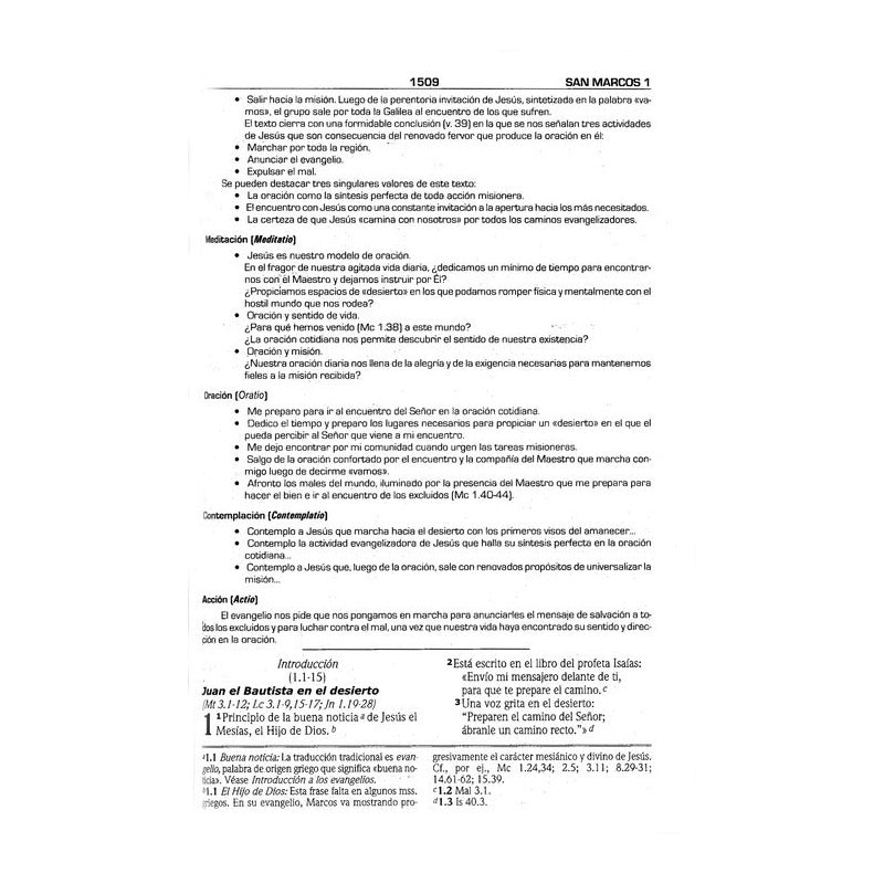 • Presenta el texto bíblico «Dios habla hoy», una traducción con carácter dinámico y moderno, que ofrece el mensaje en forma clara y fácil de comprender. • Incluye Deuterocanónicos. • Contiene una introducción general que presenta los 5 pasos del método Lectio Divina para el estudio del texto bíblico y la oración: Lectura, Meditación, Oración, Contemplación y Acción. El método Lectio Divina ha sido utilizado por la Iglesia Católica desde sus comienzos en la vida religiosa y monacal. Este método ayuda a profundizar en el estudio de las Sagradas Escrituras, de modo de transformarlas en una vivencia práctica. • Tiene modelos de cómo utilizar el método Lectio Divina con cada libro de la Biblia. • Provee 12.000 notas de estudio a pie de página, con referencias y ayudas para el conocimiento de las Escrituras, que explican versículos o pasajes bíblicos, facilitando la comprensión de los mismos sin necesidad de irse de la página de lectura. • Contiene 50 tablas temáticas, insertadas en el lugar correspondiente junto al texto bíblico, las cuales contribuyen a forjar una mejor idea de diversos temas específicos del relato bíblico. • Presenta un índice temático que facilita la preparación de clases bíblicas, sermones, y es útil para el estudio de las Escrituras. • Contiene referencias cruzadas que indican al lector pasajes bíblicos que abordan un tema semejante. • Contiene un glosario para aclarar el significado de diversos nombres, temas y conceptos. • Tiene 16 mapas grandes al final de la Biblia y 28 pequeños insertados a lo largo del diseño del texto bíblico, los cuales ubican geográficamente al lector para que tenga una idea más clara de los sitios donde ocurrieron los sucesos bíblicos. Carta de Presentación en la Biblia de Oración de Lectio Divina Una doble fidelidad debe conseguir una traducción de la Biblia: a Dios que habla en lenguaje humano e inspiró los textos bíblicos, y a los lectores de hoy invitados a leer la Palabra para hacerla vida. No es suficiente leer la Biblia sólo para interpretarla o conocerla. Es necesario sobre todo, dejar que la Palabra suscite el diálogo con Dios (orar) e interprete nuestras vidas y la sociedad (meditar). Los libros de la Biblia son cartas de Dios ofrecidas para entrar en comunión amistosa con el Señor de la vida y de la historia que, por Jesucristo, nos habla y nos salva. La Biblia pues, es el libro de oración y meditación por excelencia del discípulo de Jesús. Tiene en sus manos el texto “Dios habla Hoy” de Sociedades Bíblicas Unidas (SBU), que incluye todos los libros aceptados por la Iglesia Católica, en el orden alejandrino, con notas explicativas y pastorales donde también han colaborado algunos biblistas católicos. Lo novedoso de la presente edición son las pautas de oración y meditación que acompañan algunos textos de cada libro de la Biblia (lectio divina), preparadas por el equipo del Centro Bíblico Pastoral de América Latina (CEBIPAL) del Consejo Episcopal Latinoamericano (CELAM), pensando en el servicio de la palabra de Dios para todos los cristianos. Estas pautas, además de ayudarnos a entender el texto bíblico, permiten saborear la Sagrada Escritura como Palabra de Dios. En ella Él sale a nuestro encuentro, para entrar en diálogo con nosotros y para ayudarnos a moldear una vida que cada vez más se parezca a la de Cristo. Así, transformados por la fuerza de la Palabra, somos enviados a trabajar por una sociedad más justa para todos. Que la Biblia orada y meditada se convierta cada día más en el pan anhelado de aquel que tiene verdadero “hambre de oír la palabra del Señor” (Amós 8,11) Se deja al criterio ponderado de las Conferencias Episcopales de América Latina la divulgación y utilización de esta Biblia de Sociedades Bíblicas Unidas preparada en colaboración con biblistas católicos. + Santiago Silva Retamales Obispo Auxiliar de Valparaíso, Chile