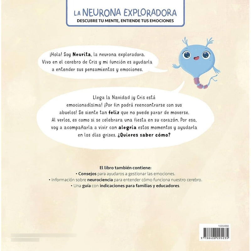 ¡Hola! Soy Neurita, la neurona exploradora. Vivo en el cerebro de Cris y mi función es ayudarla a entender sus pensamientos y emociones. Llega la Navidad ¡y Cris está emocionadísima! ¡Por fin podrá reencontrarse con sus abuelos! Se siente tan feliz que no puede parar de moverse. Al verlos, es como si se celebrara una fiesta en su corazón. Por eso, voy a acompañarla a vivir con alegría estos momentos y ayudarla en los días grises. ¿Quieres saber cómo? En estas páginas, además de descubrir qué ocurre en nuestro cuerpo cuando estamos contentos, encontraremos herramientas para actuar frente a distintas emociones.