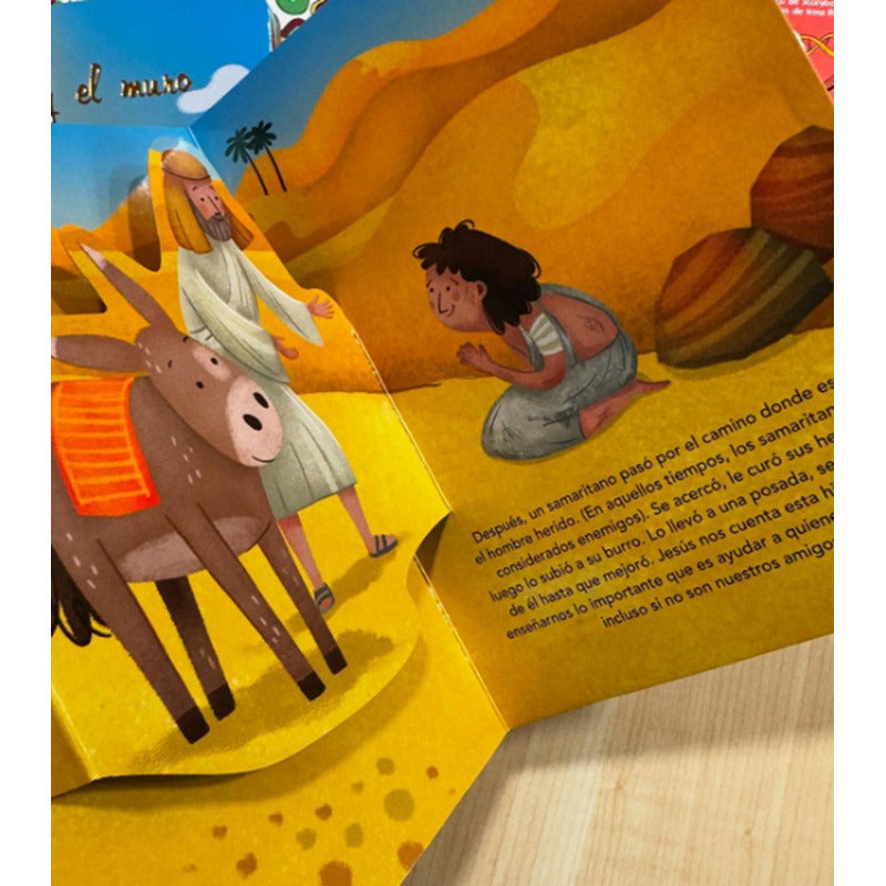 Disfruta junto a tu hijo de la lectura de este interesante libro. Con brillantes y coloridos Pop-up en cada página, les encantará cada detalle mientras esta historia bíblica cobra vida frente a sus ojos. El buen samaritano ayudó a un hombre que había sido atacado, a pesar de que los demás lo consideraban un enemigo. Volumen en tapa rústica e interiores en cartón plastificado Tamaño: 15 x 20 cm. 8 páginas desplegables Ilustraciones a todo color ISBN: 9789962186557