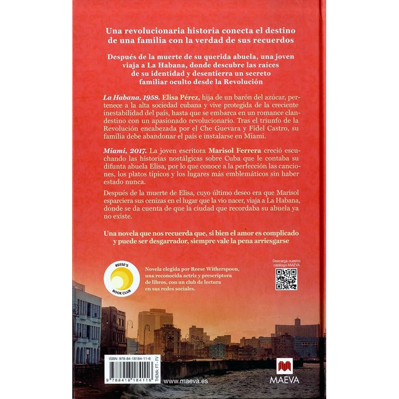 Un viaje lleno de nostalgia y amor a un lugar que sigue vivo en la memoria. Tras la muerte de su querida abuela, una escritora estadounidense viaja a La Habana, donde descubre las raíces de su identidad y desentierra un secreto familiar oculto desde la Revolución. La Habana, 1958. Elisa Pérez, hija de un barón del azúcar, pertenece a la alta sociedad cubana y vive protegida de la creciente inestabilidad del país, hasta que se embarca en un romance clandestino con un apasionado revolucionario. Después del triunfo de la Revolución encabezada por el Che Guevara y Fidel Castro, su familia debe abandonar el país e instalarse en Miami. Miami, 2017. La joven escritora Marisol Ferrera creció escuchando las historias nostálgicas sobre Cuba que le contaba su difunta abuela Elisa, por lo que conoce a la perfección las canciones, los platos típicos y los lugares más bonitos sin haber estado nunca. Tras la muerte de Elisa, cuyo último deseo era que Marisol esparciera sus cenizas en el lugar que la vio nacer, viaja a La Habana, donde se da cuenta de que la ciudad que recordaba su abuela ya no existe. Autor: Chanel Cleeton Editorial: Maeva Año: 2020 Idioma: Español N° páginas: 368 Encuadernación: Tapa blanda ISBN: 9788418184116