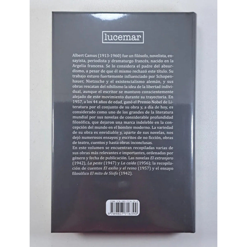 En este volumen se encuentran recopiladas varias de sus obras más relevantes e importantes, ordenadas por género y fecha de publicación. Las novelas «El extranjero» (1942), «La peste» (1947) y «La caída» (1956); la recopilación de cuentos «El exilio y el reino» (1957) y el ensayo filosófico «El mito de Sísifo» (1942). Albert Camus (1913-1960) fue un filósofo, novelista, ensayista, periodista y dramaturgo francés, nacido en la Argelia francesa. Se lo considera el padre del absurdismo, a pesar de que él mismo rechazó este título. Su trabajo estuvo fuertemente influenciado por Schopenhauer, Nietzsche y el existencialismo alemán, y sus obras rescatan del nihilismo la idea de la libertad individual, aunque el escritor se mantuvo conscientemente alejado de este movimiento durante su trayectoria. En 1957, a los 44 años de edad, ganó el Premio Nobel de Literatura por el conjunto de su obra y, a día de hoy, es considerado como uno de los grandes de la literatura mundial por sus novelas de considerable profundidad filosófica, que dejaron una marca indeleble en la concepción del mundo en el hombre moderno. La variedad de su obra es envidiable y, aparte de sus novelas, nos dejó numerosos ensayos y escritos de no ficción, obras de teatro, cuentos y hasta obras inconclusas.