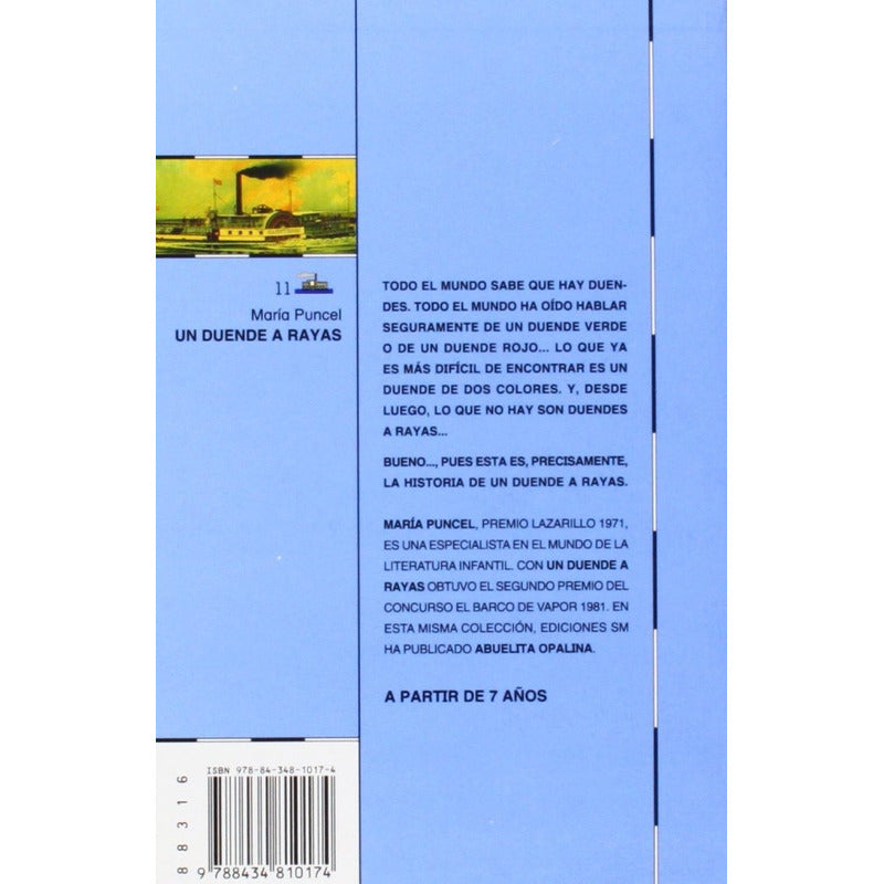 Un Duende a Rayas / María Puncel Rayas no es un duende como otro cualquiera. Es un duende a rayas. Cuando se hace mayor, su familia le aconseja que viaje para que se descubra a sí mismo y decida de qué color quiere ser. En su viaje aprende muchas cosas y decide que él no quiere ser un duende de un único color. Será siempre un duende a rayas. Más adelante, se descubre que hay un duende negro arrugado. Éste es un duende desdichado, que hace el mal a los demás resentido por los maltratos que una bruja le causó cuando era pequeño. Rayas cree que, si se le trata con cariño, el duende negro arrugado mostrará agradecimiento y se volverá bueno. Rayas tenía razón. Al final, el duende negro arrugado se vuelve bueno. Rayas ha conseguido que sea feliz y que ayude a los demás.