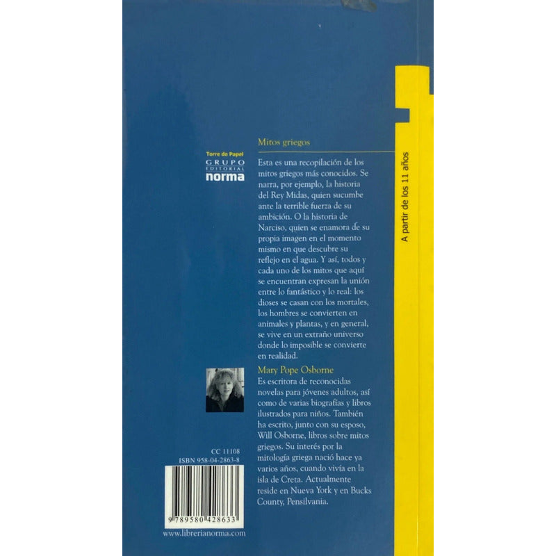 MITOS GRIEGOS / MARY POPE OSBORNE Recopilación de los mitos griegos más conocidos. Se narran, entre otras, la historia del rey Midas, quien sucumbe ante la terrible fuerza de su ambición. O la historia de Narciso, quien se enamora de su propia imagen en el momento mismo en que descubre su reflejo en el agua. Y así, todos y cada uno de los mitos que aquí se encuentran expresan la unión entre lo fantástico y lo real: los dioses se casan con los mortales, los hombres se convierten en animales y plantas, y en general, se vive en un extraño universo donde lo imposible se convierte en realidad.