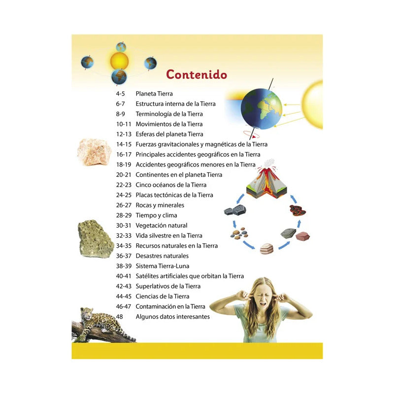 Terminología de la Tierra Movimientos de la Tierra Fuerzas gravitacionales y magnéticas de la Tierra Continentes en la Tierra Cinco océanos de la Tierra Tiempo y clima Vida silvestre de la Tierra