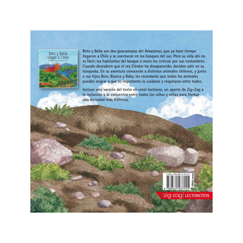 BETO Y BELLA BUSCAN AL REY CÓNDOR Autor Ramos, Gary Ilustraciones de Franck, Marianela Editorial Zig-Zag ISBN 9789561237155 Beto y Bella ya se han asentado en Chile, pero su vida acá no es fácil. Los otros animales a veces los miran con desconfianza y los critican por sus costumbres. Cuando descubren que el rey Cóndor está desaparecido, deciden salir en su búsqueda. En su aventura van ayudando a distintos animales chilenos en problemas, demostrando que los “afuerinos” también son un aporte para el lugar al que han llegado. Es la continuación de "Beto y Bella llegan a Chile", que ha vendido + 13.000 ejemplares. Incluye una versión del texto en creol haitiano. El libro busca ser un aporte a la inclusión y al encuentro entre todos los niños y niñas para formar una sociedad más fraterna. Autor Ramos, Gary Nacionalidad del autor Venezolana Ilustrador Franck, Marianela Nacionalidad del ilustrador chilena Colección Lectorcitos Formato (cm) 20 Alto X 20 Ancho X 0,8 Espesor Páginas 40 Tipo de tapa Rústica Rango Edad Desde 06 País de impresión Chile