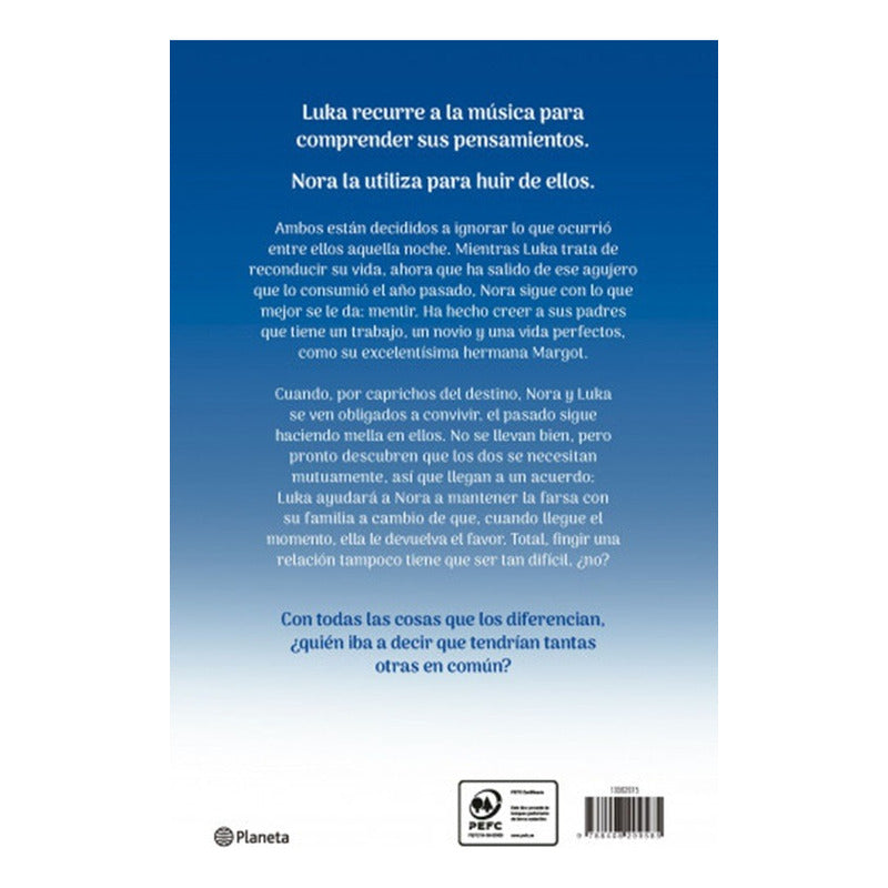 Ambos están decididos a ignorar lo que ocurrió entre ellos aquella noche. Mientras Luka trata de reconducir su vida, ahora que ha salido de ese agujero que lo consumió el año pasado, Nora sigue con lo que mejor se le da: mentir. Ha hecho creer a sus padres que tiene un trabajo, un novio y una vida perfectos, como su excelentísima hermana Margot. Cuando, por caprichos del destino, Nora y Luka se ven obligados a convivir, el pasado sigue haciendo mella en ellos. No se llevan bien, pero pronto descubren que los dos se necesitan mutuamente, así que llegan a un acuerdo: Luka ayudará a Nora a mantener la farsa con su familia a cambio de que, cuando llegue el momento, ella le devuelva el favor. Total, fingir una relación tampoco tiene que ser tan difícil, ¿no?