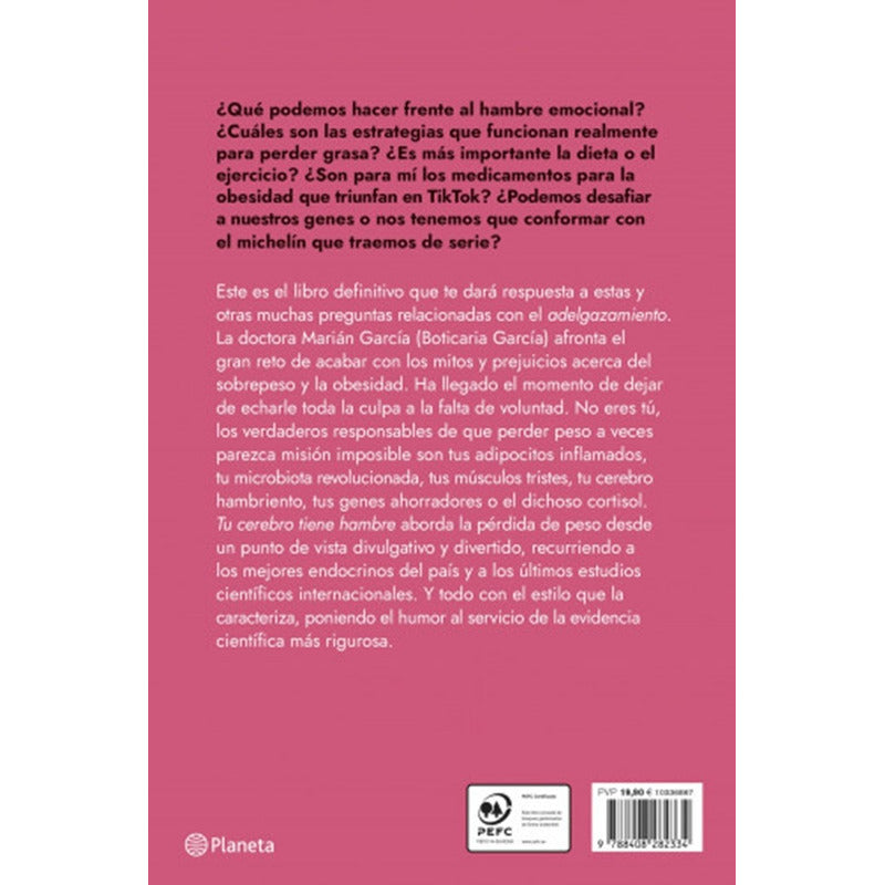 ¿Qué podemos hacer frente al hambre emocional? ¿Cuáles son las estrategias que funcionan realmente para perder grasa? ¿Es más importante la dieta o el ejercicio? ¿Son para mí los medicamentos para la obesidad que triunfan en TikTok? ¿Podemos desafiar a nuestros genes o nos tenemos que conformar con el michelín que traemos de serie? Este es el libro definitivo que te dará respuesta a estas y otras muchas preguntas relacionadas con el adelgazamiento.La doctora Marián García (Boticaria García) afronta el gran reto de acabar con los mitos y prejuicios acerca del sobrepeso y la obesidad. Ha llegado el momento de dejar de echarle toda la culpa a la falta de voluntad. No eres tú, los verdaderos responsables de que perder peso a veces parezca misión imposible son tus adipocitos inflamados, tu microbiota revolucionada, tus músculos tristes, tu cerebro hambriento, tus genes ahorradores o el dichoso cortisol.