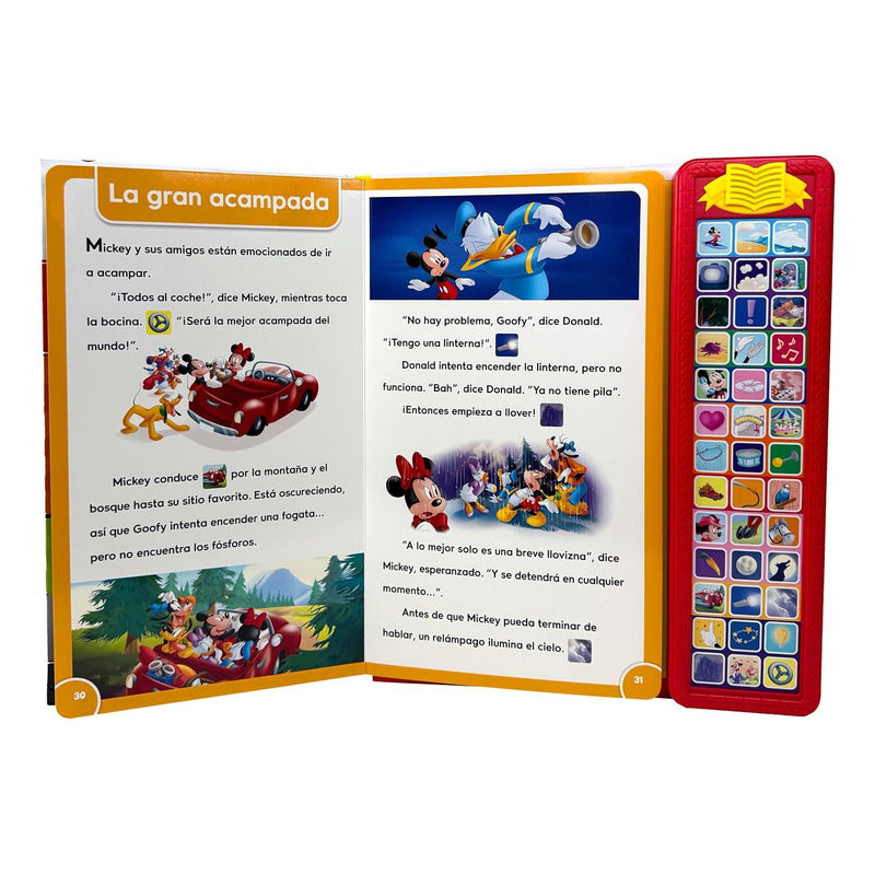 ¡Únete a Mickey, Minnie y sus amigos en ocho dulces y tontas aventuras! Mientras lees, presiona 39 botones de sonido para que las historias cobren vida con música y sonidos divertidos. Hacer coincidir palabras e imágenes con sonidos desarrolla la comprensión lectora e interactuar con personajes queridos abre el camino hacia un amor por la lectura para toda la vida.
