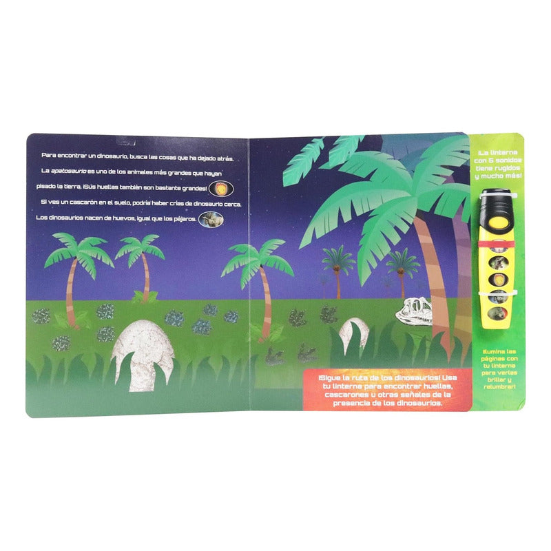 Jurassic World, "Dinosaurios en la Oscuridad"; ¡La linterna con 5 sonidos tiene ruidos y mucho más! ¡Ilumina las páginas con tu linterna para verlas brillar y relumbrar! ¡Cuidado! ¡Hay dinosaurios en la oscuridad! Toma tu linterna y haz una excursión por Jurassic World para descubrir los increíbles dinosaurios que habitan la isla