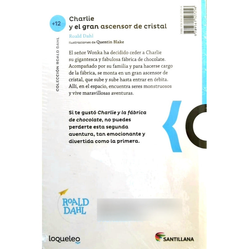 Charlie Y El Gran Ascensor De Cristal / Roald Dahl Reseña: EL SEÑOR WONKA HA DECIDIDO CEDER A CHARLIE SU GIGANTESCA Y FABULOSA FÁBRICA DE CHOCOLATE, Y ESTO HARÁ QUE SU VIDA CAMBIE POR COMPLETO. ACOMPAÑADO POR SU FAMILIA Y PARA HACERSE CARGO DE LA FÁBRICA, MONTARÁ EN UN GRAN ASCENSOR DE CRISTAL, QUE SUBIRÁ Y SUBIRÁ HASTA ENTRAR EN ÓRBITA. Y SERÁ ALLÍ, EN EL ESPACIO, DONDE TODOS VIVAN LAS MÁS INCREÍBLES AVENTURAS.