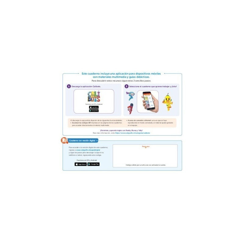 Calibots Preschool Starter A partir de 3 años (Playgroup) EDICION VIGENTE 2023 Este cuaderno de actividades para el aprendizaje del idioma inglés para niños y niñas, tiene como propósito introducirlos en este idioma de una manera lúdica y progresiva. El cuaderno de actividades está organizado en nueve unidades temáticas, en las cuales se desarrolla: vocabulario, estructuras gramaticales y comprensión auditiva. Incluye unidad complementaria para trabajar efemérides nacionales presentes en el año escolar, logrando mayor pertinencia y cercanía con la realidad de los niños. Unit 1: Me and my friends Unit 2: My school Unit 3: My family Unit 4: My body Unit 5: My favorite food Unit 6: My clothes Unit 7: My pets Unit 8: Day and night Unit 9: My toys Extra unit: Special dates (Mother's Day, Father's Day, Children's Day, Christmas). Incluye código para acceder a la app