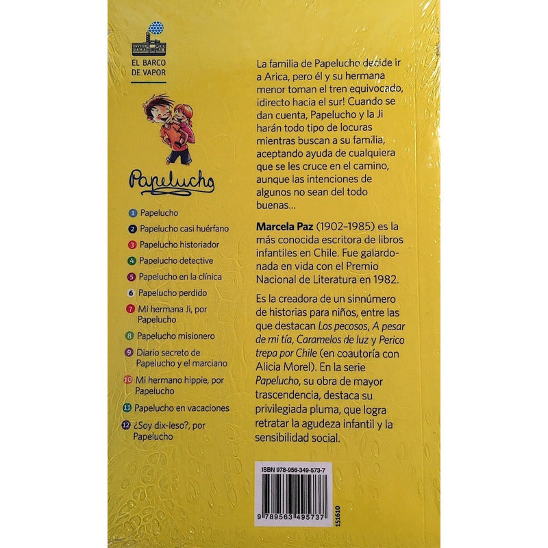 Papelucho 6 Perdido / Marcela Paz Reseña: 112 PÁGINAS. LA FAMILIA DE PAPELUCHO DECIDE IR A ARICA, PERO PAPELUCHO Y SU HERMANA TOMAN EL TREN EQUIVOCADO ¡DIRECTO HACIA EL SUR!. CUANDO SE DA CUENTA PAPELUCHO Y LA JI HARÁN TODO TIPO DE LOCURAS MIENTRAS BUSCAN A SU FAMILIA, ACEPTANDO AYUDA DE CUALQUIERA QUE SE LES CRUCE EN EL CAMINO, AUNQUE LAS INTENCIONES..