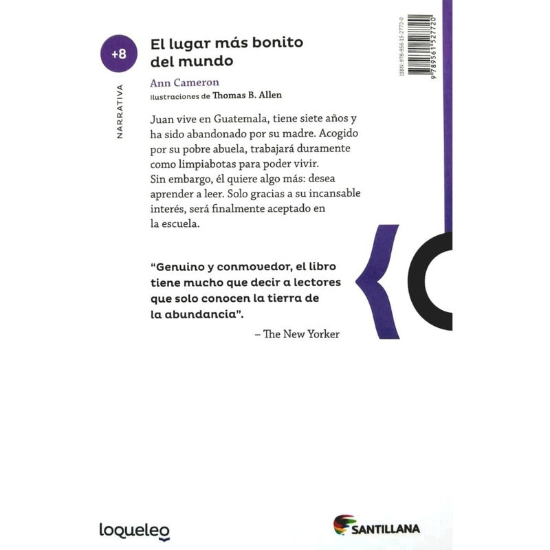 El Lugar Mas Bonito Del Mundo / Ann Cameron Reseña: 76 PÁGINAS. JUAN ES UN NIÑO DE SIETE AÑOS QUE VIVE EN GUATEMALA. ABANDONADO POR SU MADRE ES ACOGIDO POR LA ABUELA, QUE ES MUY POBRE, AUNQUE TIENE UNA CASITA PROPIA. JUAN APRENDE EL OFICIO DE LIMPIABOTAS, TRABAJA MUCHO Y GANA DINERO, PERO QUIERE HACER ALGO MÁS QUE LIMPIAR ZAPATOS, ES INTELIGENTE, QUIERE PROGRESAR, APRENDER A LEER, IR A LA ESCUELA, QUIZÁ MÁS ADELANTE IR A LA UNIVERSIDAD. LA ABUELA SE SIENTE MUY ORGULLOSA DE SU NIETO Y LE EXPLICA CUÁL ES PARA ELLA EL LUGAR MÁS BONITO DEL MUNDO.