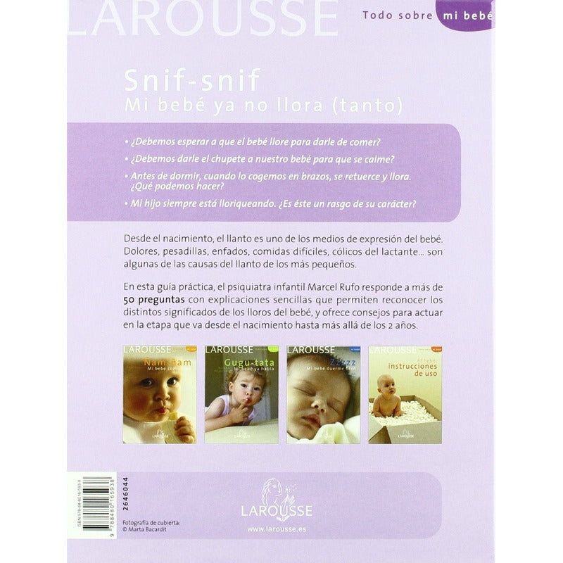 Snif Snif Mi Bebe Ya No Llora (tapa Dura) / Rufo Y Schilte Reseña: 112 PÁGINAS. Este manual forma parte de la colección «Todo sobre mi bebé», que pretende ayudar a los padres, sobre todo a los primerizos, en esa época en que las dudas forman parte del día a día. Snif-snif. Mi bebé ya no llora (tanto) es una obra muy práctica y manejable, que organiza la información de una manera muy clara, en forma de 50 preguntas y sus respuestas. El manual, avalado por el prestigio del doctor Marcel Rufo, permite reconocer los distintos significados del lloro del bebé y ofrece consejos para actuar en la etapa que va desde el nacimiento hasta más allá de los 2 años. Snif-snif. Mi bebé ya no llora (tanto) es además un manual muy gráfico, repleto de fotografías que ejemplifican las especificaciones y que permiten que el libro ofrezca un aspecto muy atractivo. Al final del mismo, un índice y un apartado de páginas web y de direcciones útiles refuerzan el carácter práctico de este manual, pensado para los padres de hoy.