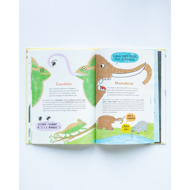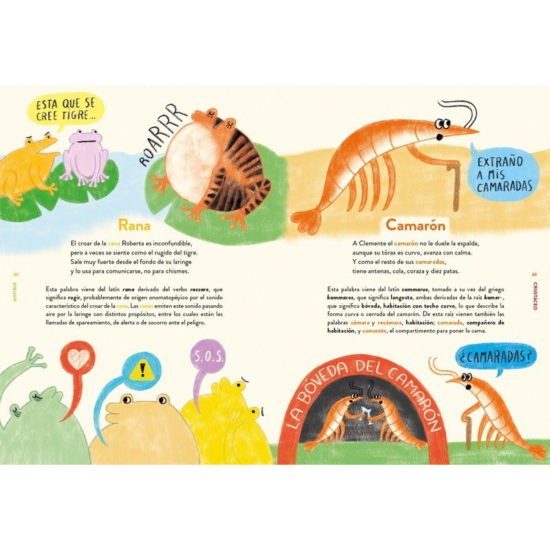 Animalario Etimologico / Trinidad Y Valentina Silva 51 PÁGINAS. Este libro reúne a aquellos animales cuyo nombre tiene una interesante historia que contar. ¿Qué podría significar “anfibio”? ¿Cómo se relaciona el nombre “murciélago” con un ratón? ¿Tendrá algo que ver la palabra “hipopótamo” con un caballo? A partir del origen, de la evolución y de la historia del significado de los nombres podremos reconocer las principales características de algunos mamíferos, reptiles, crustáceos y aves del reino animal.