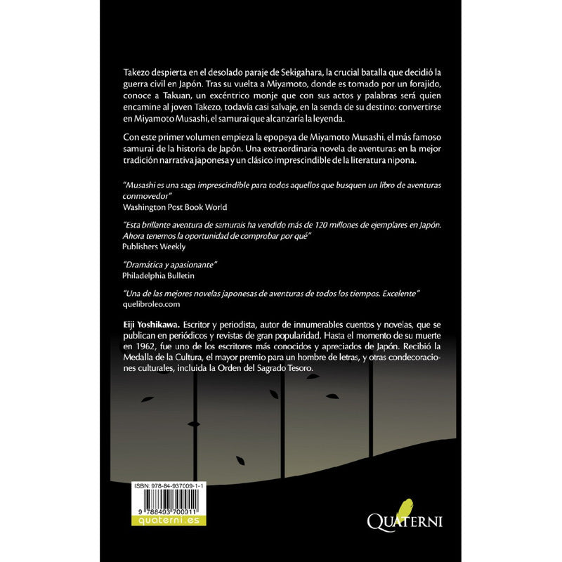 Musashi 1 La Leyenda Del Samurai / Yoshikawa Reseña: 368 PÁGINAS. Descubre la vida de Miyamoto Musashi, el más famoso samurai de toda la historia de Japón. Vivió los tiempos convulses de la post Guerra civil, el feudalismo y las reformas sociales que afectaban de modo especial a los “ronin”, aquellos samurais que, como Musashi, carecían de amo. Mezcla de ficción y realidad, es una obra fundamental para acceder al mito, gozando de una popularidad e influencia inigualables. Una extraordinaria novela de aventuras en la mejor tradición narrativa japonesa. Un relato vivo, sutil e imaginativo, rebosante de personajes memorables que pintan vividamente un mundo que durante mucho tiempo fue impenetrable para occidente. Un clásico imprescindible de las letras niponas. Takezo despierta en el desolado paraje de Sekigahara, la crucial batalla que decidió la guera civil de Japón. Tras su vuelta a Miyamoto, donde es tomado por un forajido, conoce a Takuan, un excéntrico monje que con sus actos y palabras sera quien encamine al joven Takezo, todavía casi salvaje, en la senda de su destino: convertirse en Miyamoto Musashi, el samurai que alcanzará a ser leyenda.'