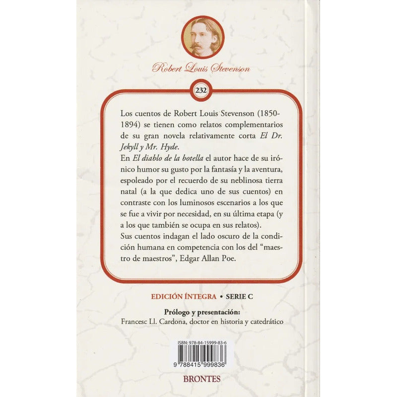 El Diablo De La Botella Y Otros Relatos / R.l. Stevenson Reseña: 11 x 18 cm | 160 páginas | ISBN: 978-84-15999-83-6 Los cuentos de Robert Louis Stevenson (1850-1894) se tienen como relatos complementarios de su gran novela relativamente corta El Dr. Jekyll y Mr. Hyde. En El diablo de la botella el autor hace de su irónico humor su gusto por la fantasía y la aventura, espoleado por el recuerdo de su neblinosa tierra natal (a la que dedica uno de sus cuentos) en contraste con los luminosos escenarios a los que se fue a vivir por necesidad, en su última etapa (y a los que también se ocupa en sus relatos). Sus cuentos indagan el lado oscuro de la condición humana en competencia con los del “maestro de maestros”, Edgar Allan Poe.