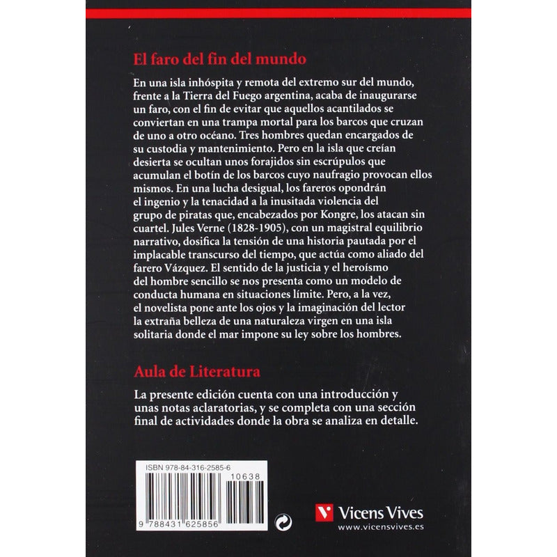 El Faro Del Fin Del Mundo / Julio Verne Reseña: 264 PÁGINAS. En el extremo sur de América, se encuentra la pequeña y desolada Isla de los Estados, rodeada de un océano hostil y azotada por terribles borrascas. En esta apasionante novela de aventuras se narra la instalación de un faro como ayuda a la navegación, la trágica muerte de dos de los fareros a manos de una banda de piratas y el heroico rescate final.