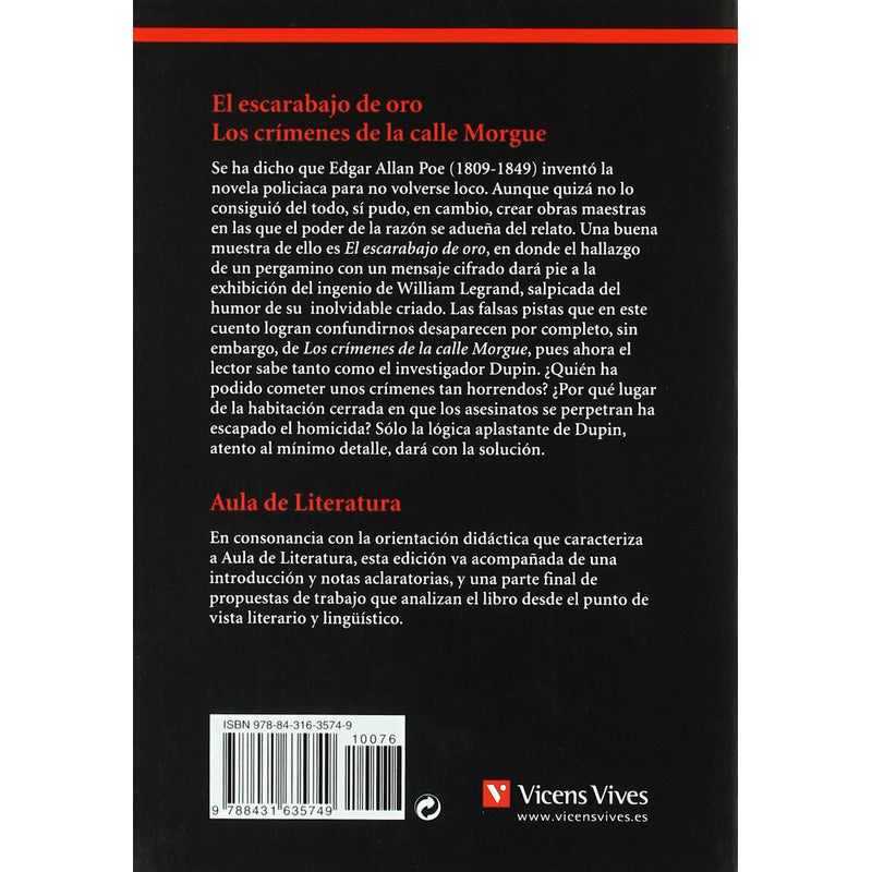 El Escarabajo De Oro & Crimenes De La Calle Morgue / E.a Poe Reseña: 160 PÁGINAS, TAPA BLANDA. Se ha dicho que Edgar Allan Poe (1809-1849) inventó la novela policiaca para no volverse loco. Aunque quizá no lo consiguió del todo, sí pudo, en cambio, crear obras maestras en las que el poder de la razón se adueña del relato. Una buena muestra de ello es El escarabajo de oro, en donde el hallazgo de un pergamino con un mensaje cifrado dará pie a la exhibición del ingenio de William Legrand, salpicada del humor de su inolvidable criado. Las falsas pistas que en este cuento logran confundirnos desaparecen por completo, sin embargo, de Los crímenes de la calle Morgue, pues ahora el lector sabe tanto como el investigador Dupin. ¿Quién ha podido cometer unos crímenes tan horrendos? ¿Por qué lugar de la habitación cerrada en que los asesinatos se perpetran ha escapado el homicida? Sólo la lógica aplastante de Dupin, atento al mínimo detalle, dará con la solución. En consonancia con la orientación didáctica que caracteriza a Aula de Literatura, esta edición va acompañada de una introducción y notas aclaratorias, y una parte final de propuestas de trabajo que analizan el libro desde el punto de vista literario y lingüístico.