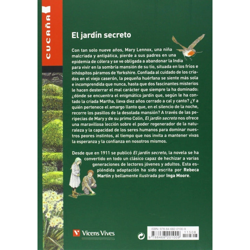 El Jardín Secreto / Frances Hodgson 176 páginas. Con tan solo nueve años, Mary Lennox, una niña malcriada y antipática pierde a sus padres en una epidemia de cólera y se ve obligada a abandonar la India para vivir en la sombría mansión de su tío, situada en los fríos e inhóspitos páramos de Yorkshire. Confiada al cuidado de los criados en el viejo caserón, la pequeña huérfana se siente más sola e incomprendida que nunca, hasta que dos fascinantes misterios le hacen desterrar el mal carácter que siempre la ha dominado: ¿dónde se encuentra el enigmático jardín que, según le ha contado la criada Martha, lleva diez años cerrado a cal y canto? ¿Y a quién pertenece el amargo llanto que, en el silencio de la noche, recorre los pasillos de la desolada mansión? A través de las peripecias de Mary y de su primo Colin, El jardín secreto nos ofrece una maravillosa lección sobre el poder regenerador de la naturaleza y la capacidad de los seres humanos para dominar nuestros peores instintos, al tiempo que nos invita a mantener vivas la esperanza y la confianza en nosotros mismos. Desde que en 1911 se publicó El jardín secreto, la novela se ha convertido en todo un clásico capaz de hechizar a varias generaciones de lectores jóvenes y adultos. Esta espléndida adaptación ha sido escrita por Rebeca Martín y bellamente ilustrada por Inga Moore.