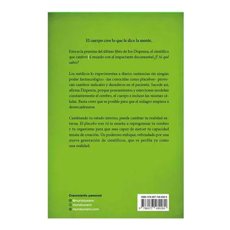 El Placebo Eres Tu (descubre Poder De Tu Mente) / Dispenza 408 PÁGINAS. La mente posee unas capacidades asombrosas. No solo es capaz de transformar la experiencia sino también de influir en la materia: tomando el control del pensamiento y las emociones podemos reprogramar nuestras células; poseemos la maquinaria biológica y neurológica necesaria para hacerlo. Esta es la premisa del nuevo libro de Joe Dispenza, el científico que salto a la fama con el impactante documental Y tu que sabes? Un placebo es una sustancia sin ningún poder farmacológico que, sin embargo, provoca un efecto positivo en el paciente. Que pasaría, pregunta Joe Dispenza, si las personas creyeran en si mismas en vez de confiar en algo externo? Apoyándose en los últimos hallazgos científicos, Dispenza nos ofrece infinidad de ejemplos de las posibilidades de la mente para provocar cambios. Lo que es aun mas interesante: nos ensena a utilizar la denominada ciencia de la transformación para ejercer nuestra capacidad innata de creación en nuestro cuerpo... y en nuestra vida.
