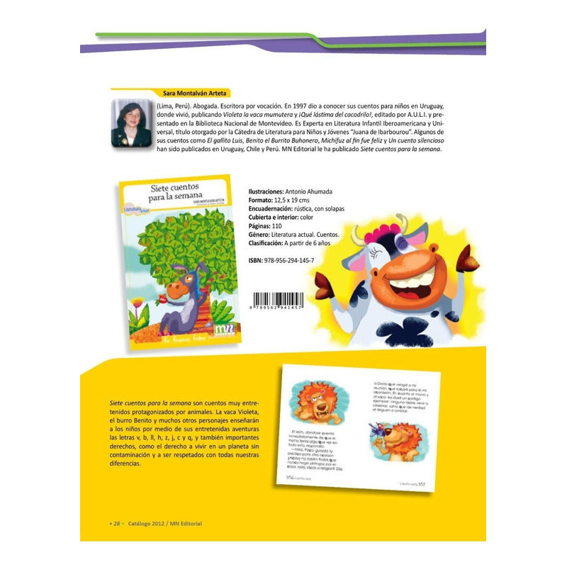 Siete Cuentos Para La Semana / Sara Montalvan Reseña: 107 PÁGINAS. Siete cuentos para la semana son cuentos muy entretenidos protagonizados por animales. La vaca Violeta, el burro Benito y muchos otros personajes enseñarán a los niños por medio de sus entretenidas aventuras las letras v, b, ll, h, z, j, c y q y también importantes derechos como el derecho a vivir en un planeta sin contaminación y a ser respetados con todas nuestras diferencias.