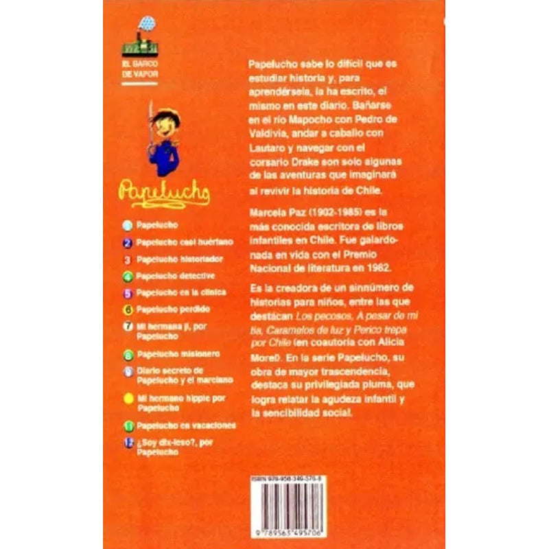 Papelucho Historiador / Marcela Paz Reseña: 112 PÁGINAS. Papelucho sabe lo dificil que es estudiar Historia y, para aprendérsela, la ha escrito el mismo en este diario. Bañarse en el río Mapocho con Pedro de Valdivia, andar a caballo con Lautaro y navegar con el corsario Drake son solo algunas de las aventuras que imaginará al revivir la historia de Chile