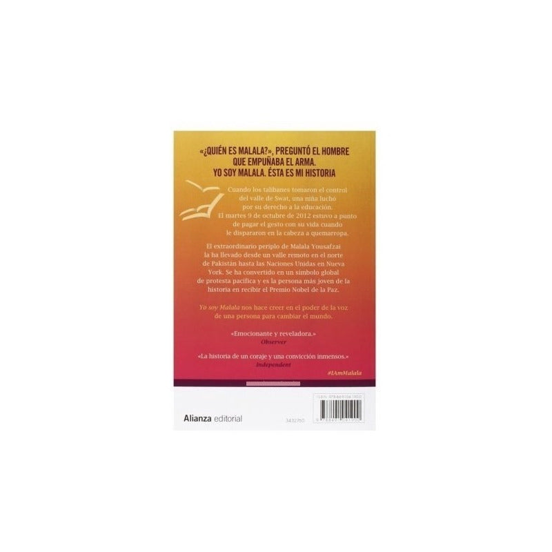 Yo Soy Malala / Malala Yousafzai 376 PÁGINAS. ¿QUIÉN ES MALALA?, PREGUNTÓ EL HOMBRE QUE EMPUÑABA EL ARMA. YO SOY MALALA. ÉSTA ES MI HISTORIA Cuando los talibanes tomaron el control del valle de Swat, una niña luchó por su derecho a la educación. El martes 9 de octubre de 2012 estuvo a punto de pagar el gesto con su vida cuando le dispararon en la cabeza a quemarropa.E l extraordinario periplo de Malala Yousafzai la ha llevado desde un valle remoto en el norte de Pakistán hasta las Naciones Unidas en Nueva York. Se ha convertido en un símbolo global de protesta pacífica y es la persona más joven de la historia en recibir el Premio Nobel de la Paz." Yo soy Malala" nos hace creer en el poder de la voz de una persona para cambiar el mundo. Emocionante y reveladora. Observer La historia de un coraje y una convicción inmensos.