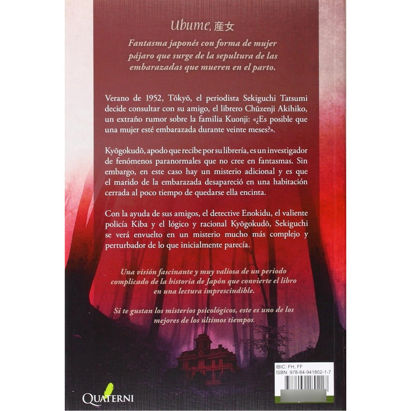 El Verano De La Ubume / Natsuhiko Kyogoku Reseña: 400 páginas. El verano de la ubume es el primer libro escrito por Natsuhiko Kyogoku. Ésta es una novela que no teme a la combinación de géneros entretejidos en su narrativa, es también una invitación para adentrarse en el thriller psicológico y en los cuentos de fantasmas a través de la tradición popular japonesa. La intriga y la expectativa permean este relato que combina, en un giro particular, la historia de la nación del sol naciente con una creciente atmósfera de suspenso de lo paranormal A QUIEN VA DIRIGIDO Este libro es una referencia obligada para los lectores que gustan de las historias de seres sobrenaturales así como para aquellos que disfrutan de las novelas policiacas y para quienes buscan acercarse a la tradición popular japonesa de una forma innovadora.