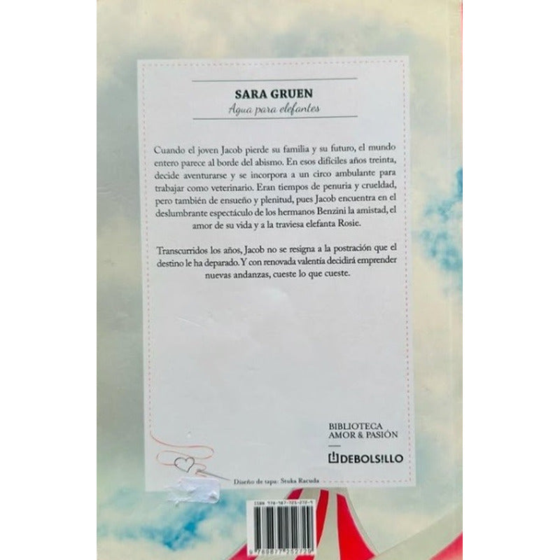 Agua Para Elefantes / Sara Gruen Todos hemos querido cambiar de vida, todos hemos querido huir alguna vez. Cuando el joven Jacob pierde todo, su familia y su futuro, y el mundo entero parece al borde del abismo en los difíciles años treinta, se aventura en un circo ambulante para trabajar como veterinario. Transcurren años de penuria y crueldad, pero también de ensueño y plenitud, pues Jacob encuentra en el deslumbrante espectáculo de los hermanos Banzini la amistad, al amor de su vida y a la traviesa elefanta Rosie. Han transcurrido ya muchos años, pero Jacob no se resigna a la postración que el destino le depara. Con renovada valentía nos revelará un secreto impactante y decidirá emprender nuevas andanzas, cueste lo que cueste. Sara Gruen, con un estilo apasionado y vibrante, ha escrito una novela aclamada por millones de libreros y lectores. Romance, lucha, asesinato, tragedia y humor integran el cartel de esta gran función que conmueve y asombra por igual. Ficha técnica del artículo