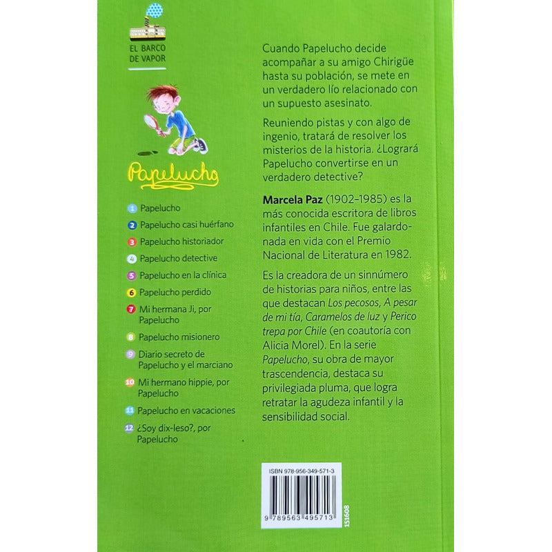 Papelucho Detective / Marcela Paz Reseña: 148 PÁGINAS. Cuando Papelucho decide acompañar a su amigo Chirigüe hasta su población, se mete en un verdadero lío relacionado con un supuesto asesinato. Reuniendo pistas y con algo de ingenio, tratará de resolver los misterios de la historia. ¿Logrará Papelucho convertirse en un verdadero detective?