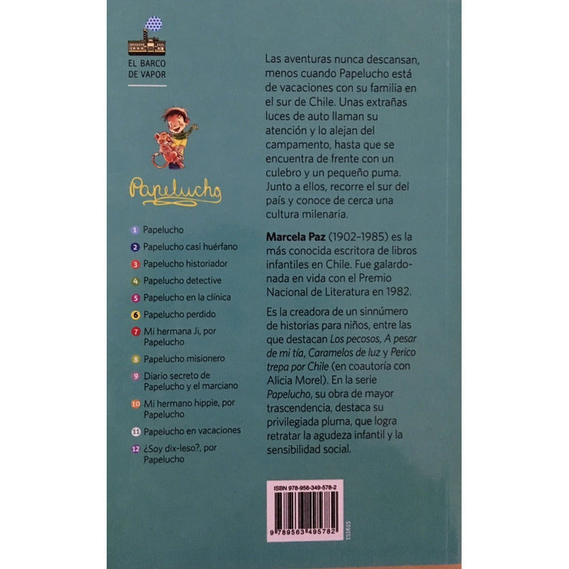 Papelucho N°11 En Vacaciones / Marcela Paz Reseña: Las aventuras nunca descansan, menos cuando Papelucho está de vacaciones con su familia en el sur de Chile. Unas extrañas luces de auto llaman su atención y lo alejan del campamento, hasta que se encuentra de frente con un culebro y un pequeño puma. Junto a ellos, recorre el sur del país y conoce de cerca una cultura milenaria.