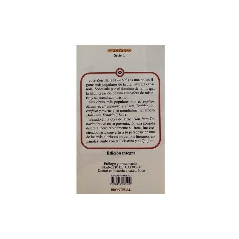 Don Juan Tenorio / Jose Zorrilla Reseña: José Zorrilla (1817-1893) es una de las figuras más populares de la dramaturgia española. Sobresale por el dominio de la intriga, la hábil creación de una atmósfera de misterio y su acendrado lirismo. Sus obras más populares son El capitán Montoya, El zapatero y el rey, Traidor, inconfeso y mártir y su mundialmente famoso Don Juan Tenorio (1844). Basado en la obra de Tirso, Don Juan Tenorio obtuvo en su presentación una acogida discreta, pero rápidamente su fama fue creciendo, hasta convertir a su personaje en uno de los más gloriosos arquetipos literarios españoles, junto con la Celestina y el Quijote.