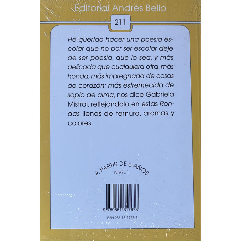 Rondas De Gabriela Mistral Reseña: De Gabriela Mistral. Dijo Gabriela: «He querido hacer una poesía escolar que no por ser escolar deje de ser poesía, que lo sea, y más delicada que cualquiera otra, más honda, más impregnada de cosas del corazón: más estremecida de soplo del alma». RONDAS DE GABRIELA MISTRAL ISBN 9561317672 Autor MISTRAL GABRIELA Editorial ANDRES BELLO Nivel A PARTIR DE 6 AÑOS Peso 0,07 Kg.Edición 2002,en Rústica 72 páginas Idioma Español