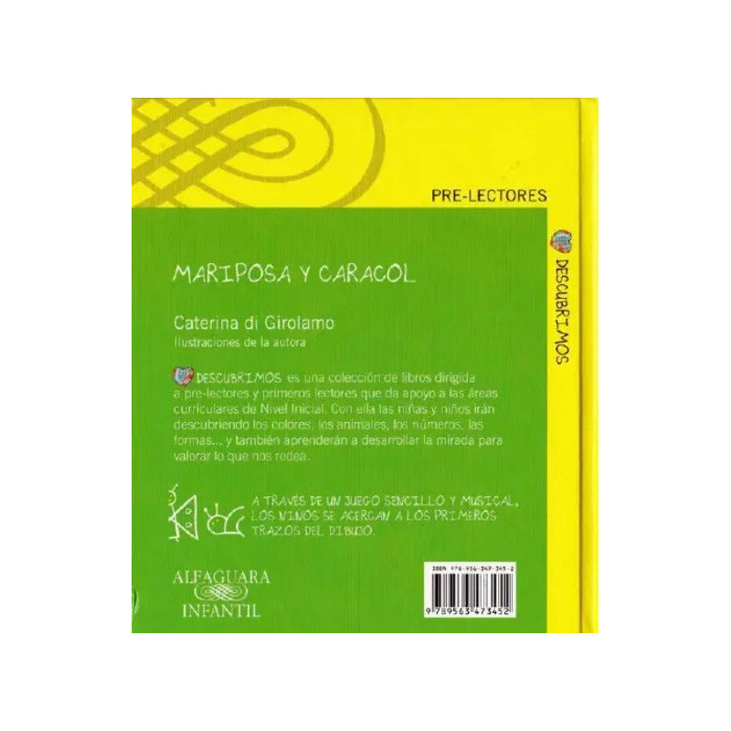Mariposa Y Caracol (tapa Dura) / Caterina Di Girolamo Reseña: Descubrimos? es una colección de libros dirigida a pre-lectores y primeros lectores que da apoyo a las áreas curriculares de Nivel Inicial. Siguiendo el mismo principio presente en Punto puntito de seguir con el cuerpo las rimas del libro para ir construyendo figuras, Mariposa y caracol encantará a los más pequeños con sus rimas divertidas y evocativas. Nuevas rimas para despertar la imaginación de los prelectores y ayudarlos en su aprendizaje lector. medidas 16 x 21 cm 44 paginas tapa dura