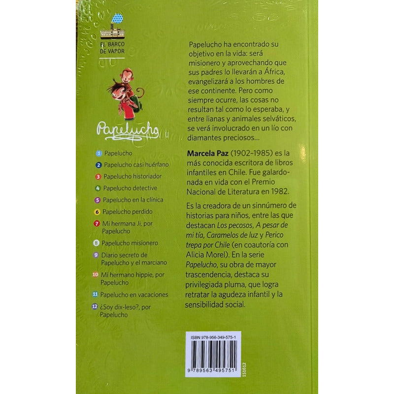 Papelucho N°8 Misionero / Marcela Paz Reseña: 152 PÁGINAS. Papelucho ha encontrado el objetivo de su vida, será misionero y aprovechando que sus padres lo llevarán a África, evangelizará a los hombres de ese continente. Pero como siempre ocurre, las cosas no resultan tal como esperaba y entre lianas y animales salvajes, se verá implicado en un lío con diamantes preciosos.