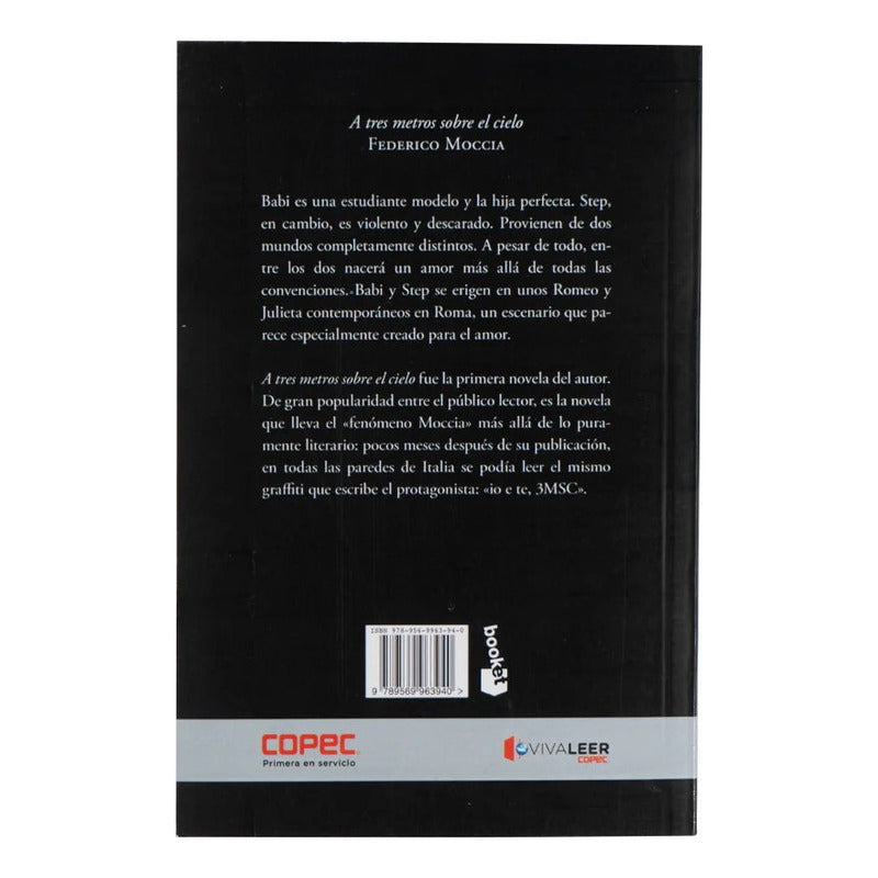 A Tres Metros Sobre El Cielo / Federico Moccia La historia de dos jóvenes que pertenecen a mundos opuestos. Es la crónica de una relación improbable, casi imposible, pero inevitable, que terminará arrastrando a la pareja a un frenético viaje iniciático en donde juntos descubrirán el primer gran amor. A tres metros sobre el cielo De bolsillo Autor: Federico Moccia Año: 1992 Editorial: Booket Páginas: 400 Medidas: 12,5x19x0,5 cm. Tipo de tapa: Rústica sin solapas Tipo de hoja interior: Bookcell 65gr Edad recomendada: A partir de los 14 años